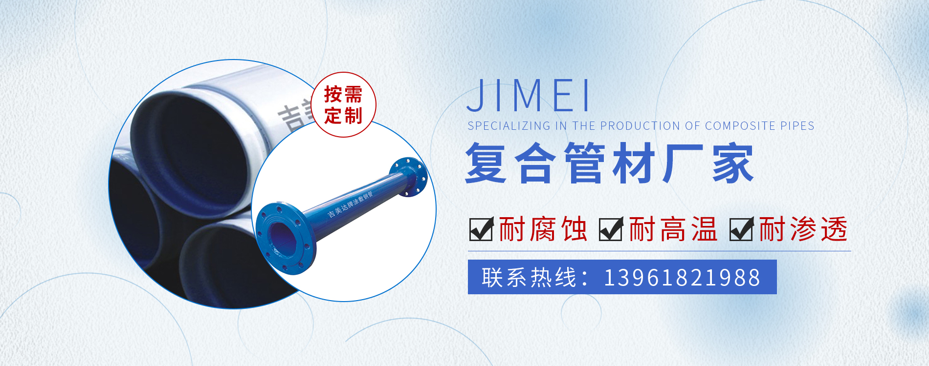 常州市吉美管業(yè)有限公司,是一家專業(yè)生產(chǎn)復(fù)合管材的生產(chǎn)企業(yè)。 依靠公司技術(shù)力量和多年的實(shí)踐經(jīng)驗(yàn),可年生產(chǎn)內(nèi)襯塑、內(nèi)襯外涂、內(nèi)外涂PE、PEX、EP復(fù)合管道以及工業(yè)防腐管道等多種復(fù)合管材及管件10萬噸的生產(chǎn)能力。